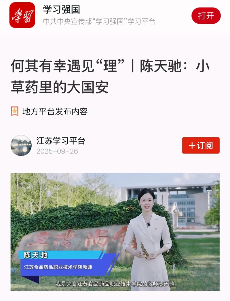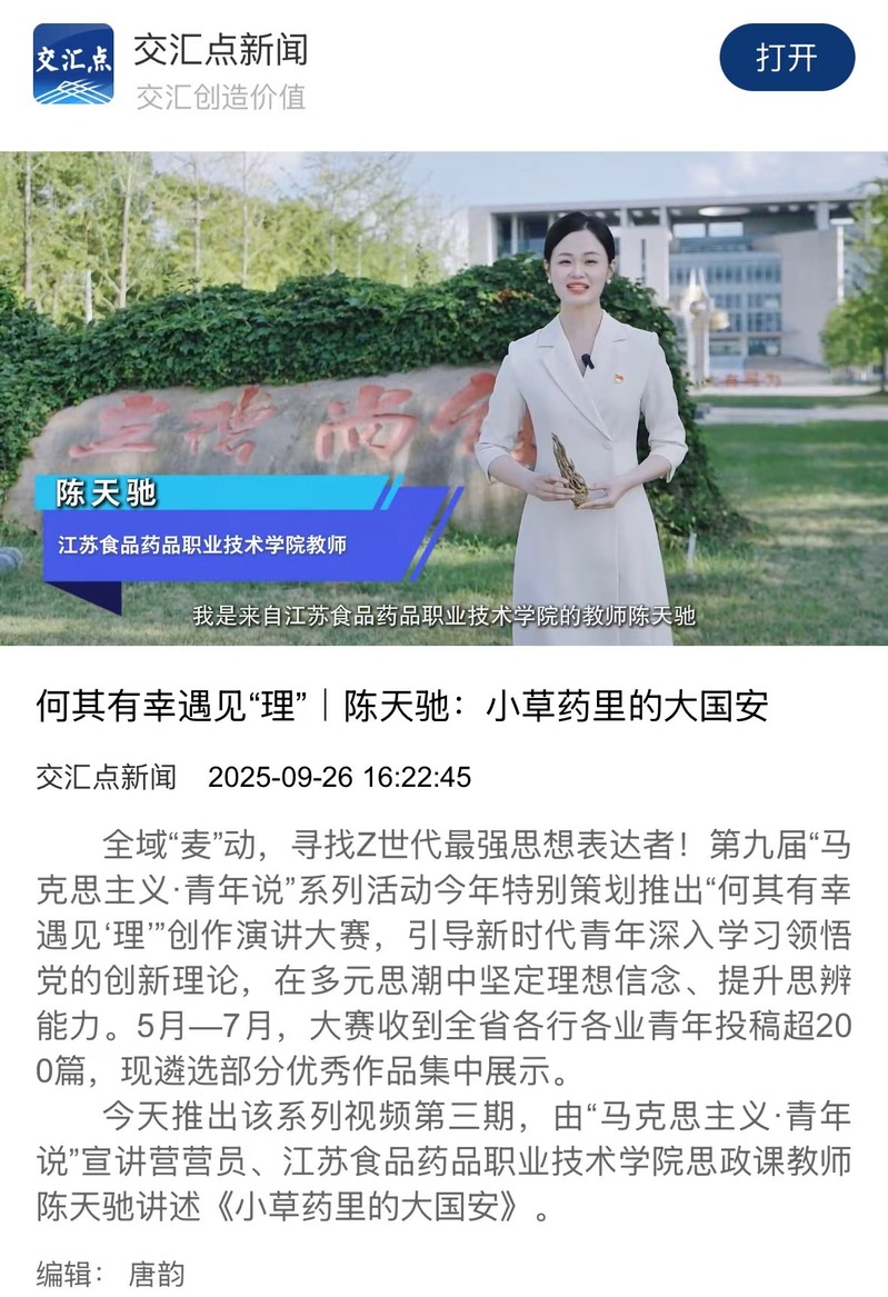 近日,马克思主义学院教师陈天驰在江苏省第九届“马克思主义·青年说”系列活动之“何其有幸遇见‘理’”创作演讲大赛中脱颖而出,其创作的宣讲视频《小草药里的大国安》在“学习强国”江苏学习平台、交汇点新闻客户端等媒体平台展播,引发广泛关注。