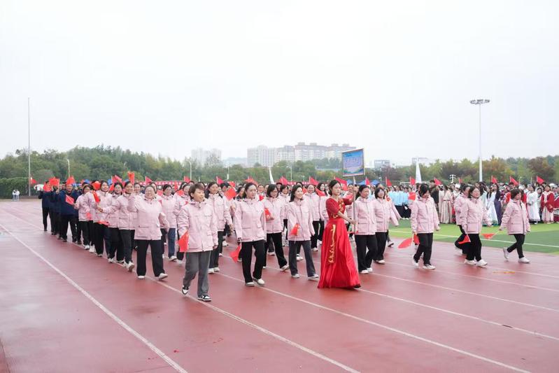 在各院部的入场式方阵展示中,马克思主义学院教师代表和机关教职工代表共同组成的教职工方阵步伐铿锵、精神抖擞,成为现场一道兼具温情与力量的亮丽风景线。伴随着激昂的《运动员进行曲》,教职工方阵身着统一服装,手持国旗,迈着整齐划一的步伐向主席台走来。