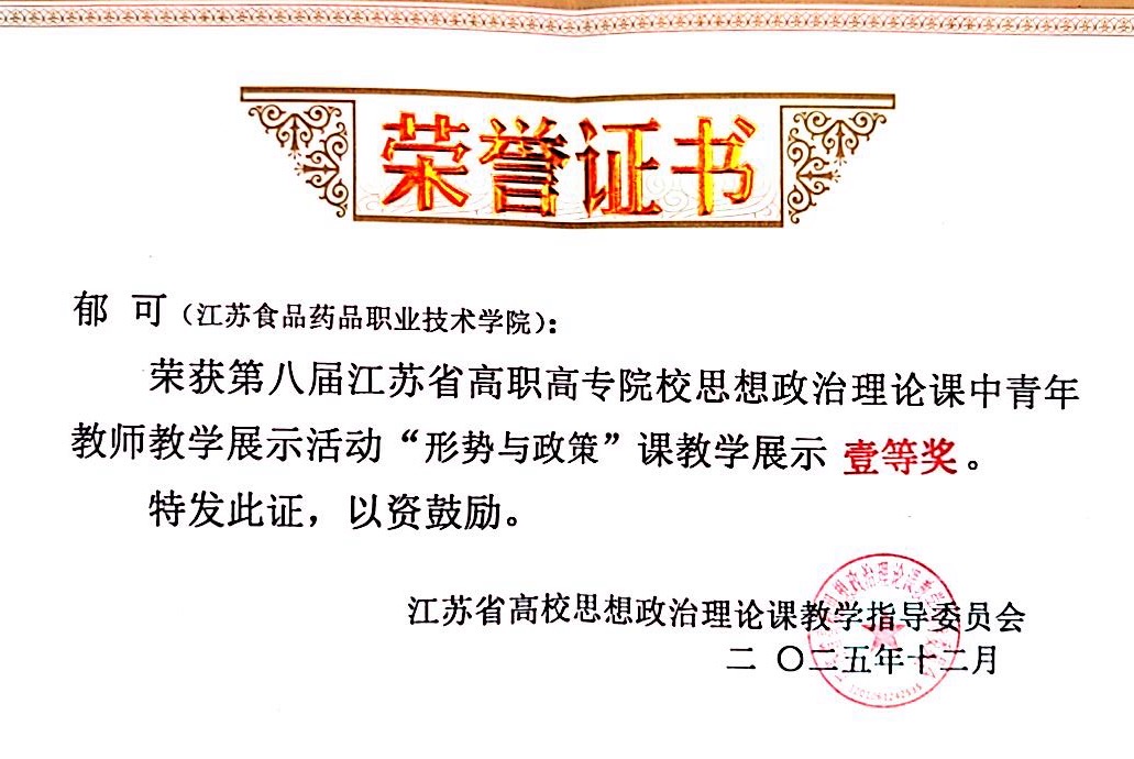 近日,第八届江苏省高职高专院校思想政治理论课中青年教师教学展示活动圆满结束。我校马克思主义学院郁可、陈天驰两位老师凭借出色表现,分别荣获《形势与政策》课程组一等奖与《习近平新时代中国特色社会主义思想概论》课程组一等奖。本次活动由江苏省高校思政课教学指导委员会高职高专分教指委主办。经前期教学材料评审,全省多所院校的优秀教师晋级现场决赛。比赛中,参赛教师随机抽取教学专题,进行10分钟现场教学展示。评审专家围绕教师的理论功底、教学设计与课堂表现等进行综合评价,全面考察教师的教学能力与专业素养。