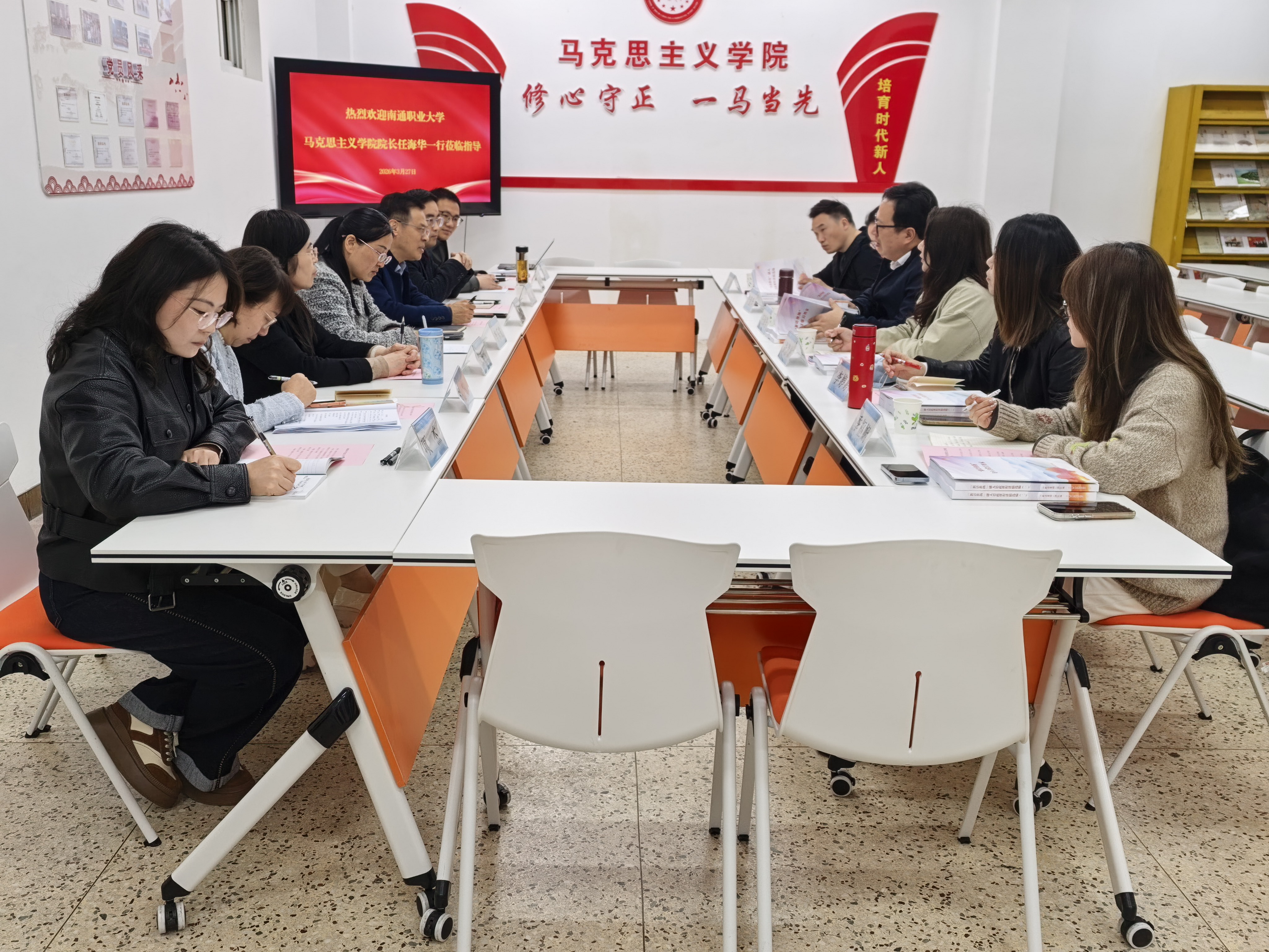 3月27日上午,南通职业大学马克思主义学院院长任海华一行6人莅临我院调研交流。马克思主义学院院长赵慧、党总支书记李乐霞、副院长高健及教研室主任参加了接待。