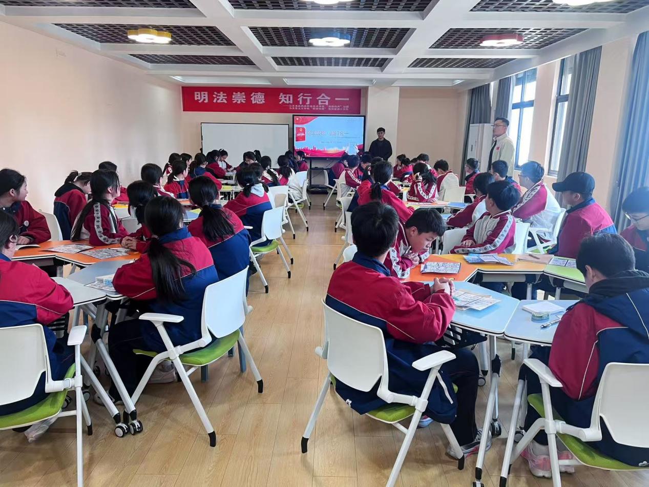 4月7日,马克思主义学院“法韵传声”社团指导老师、“新语淮扬”理论宣讲团队法治宣讲小分队成员,共同带领8名社团成员走进淮安市通甫路中学,为初一15班学生开展“明法崇德·知行合一”主题普法宣讲活动,以多元形式给孩子们送上一堂干货满满的法治教育课。