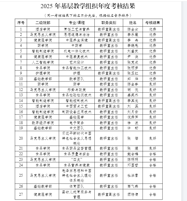 4月11日,学校公布2025年基层教学组织年度考核结果。马克思主义学院参评的五个教研室全部通过考核,其中1个获评“优秀”,2个获评“良好”,2个获评“合格”,整体通过率达100%。